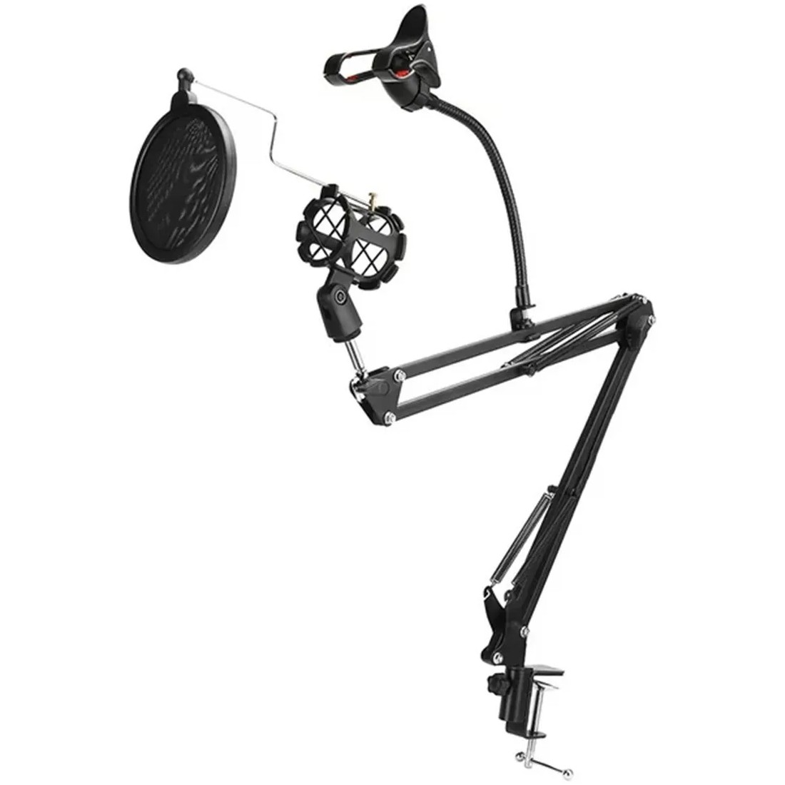 - Ideal para estúdios, transmissões ao vivo, podcasts e videoconferências, ele conta com estrutura reforçada e design ajustável para posicionar microfone e celular com total flexibilidade.